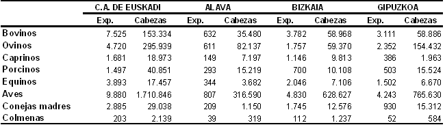 En 2005 se contabilizan 1.000 explotaciones menos con ganadería bovina (-11,7%) y 443 menos con porcina (-23%) que en 2003. El descenso en explotaciones con ganadería ovina se cifra en 393 explotaciones, es decir, un 7,7% menos.
