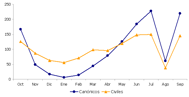 En los meses de julio, agosto y septiembre de 2006 se contabilizaron en la C.A. de Euskadi 3.286 matrimonios, lo que supone una disminución del 3,4% con respecto al mismo trimestre del año anterior, según datos de Eustat. Los vizcaínos celebraron 1.675 bodas, con una disminución del 5,2%; los alaveses, con 421 bodas, registraron un 4,1% menos y sólo los guipuzcoanos, con 1.085, tuvieron un aumento cifrado en el 2,7% respecto a igual período del año anterior. En el caso de residentes de fuera de la C.A. de Euskadi, el número de bodas ascendió a 105.