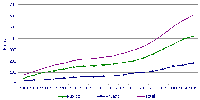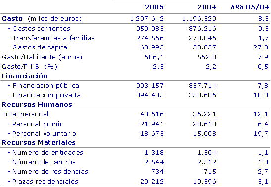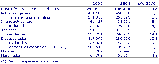 El gasto en servicios sociales en la C.A. de Euskadi alcanzó en 2005 la cifra de 1.298 millones de euros, un 8,5% más que el año anterior, lo que representó un 2,3% del PIB vasco, según datos de Eustat. El gasto medio por habitante se situó en 606 euros, de los que 422 procedieron de fondos públicos.