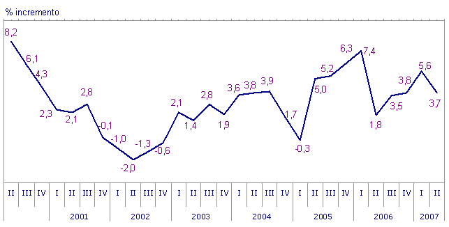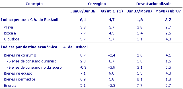 Las variaciones intermensuales en el mes de junio de 2007, sobre mayo de 2007, han sido positivas para todos los grandes sectores industriales. La Energía asciende un 7,7%, los Bienes de Equipo suben un 1,5%, los Bienes Intermedios aumentan un 0,1% y los Bienes de Consumo se incrementan un 2,6% respecto del mes de mayo. De los dos componentes de los Bienes de consumo, los Bienes de consumo duradero experimentan un ascenso intermensual del 1,8%, mientras que los Bienes de consumo no duradero aumentan un 3,1%, en comparación con el mes de mayo.