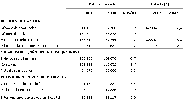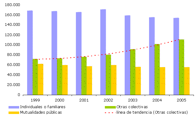 La modalidad individual o familiar es la que agrupa al mayor número de personas (48,2%), seguida de seguros colectivos (empresas u otros colectivos concretos) con el 34,6% y mutualidades públicas (17,2%). Respecto a 2004, vuelven a ser los seguros colectivos donde más crece el número de asegurados, con un incremento del 9,4%, similar al que se ha producido también en el Estado (9,9%). Por otro lado, el colectivo asegurado por las mutualidades públicas también aumenta pero levemente (0,3%), en tanto que el número de personas con un seguro individual o familiar desciende (-0,7%).