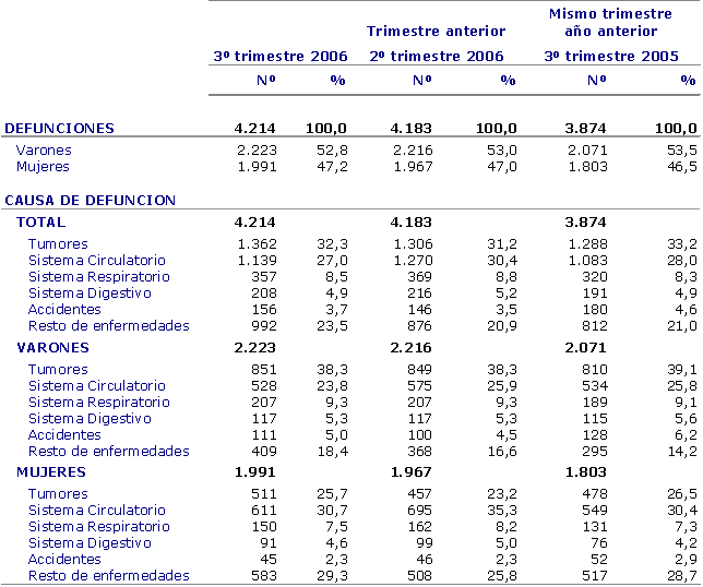 La principal causa de defunción la constituyeron los tumores: 1.362 personas fallecieron por ese motivo (32,3%); tras ella, como segunda causa de mortalidad, se encuentran las enfermedades del sistema circulatorio, que originaron 1.139 fallecimientos (27%). El tercer lugar lo ocuparon las enfermedades respiratorias, que en estos meses causaron 357 defunciones (8,5%).