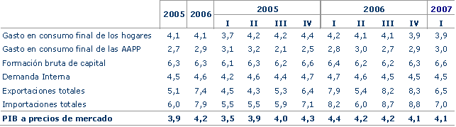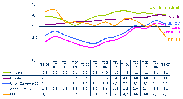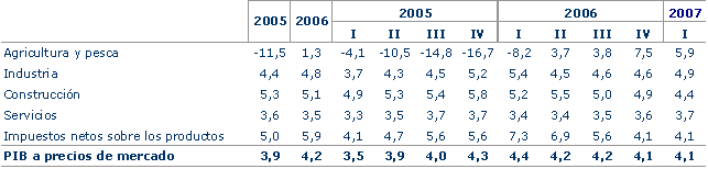 El Sector Servicios aumenta en una décima su crecimiento con respecto al trimestre anterior, logrando una tasa del 3,7%. Por una parte, los Servicios de Mercado alcanzan un crecimiento interanual del 3,9%, una décima más que en el cuarto trimestre de 2006, si bien su perfil intertrimestral pasa del 1,2% anterior al 0,5% de este primer trimestre. Por otra, los Servicios de no Mercado presentan una evolución ascendente en términos interanuales con un 2,8%, pero una trayectoria descendente en tasas intertrimestrales, pasando del 1,2% del trimestre anterior al 0,3% de éste.