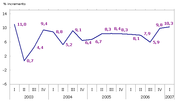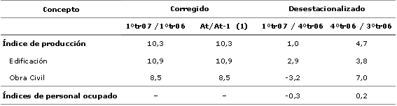 La evolución del sector de la construcción, en el primer trimestre de 2007, se ha sustentado más en el subsector de Edificación que en el de Obra Civil, alcanzando el primero una subida interanual del 10,9%, frente a un aumento del 8,5% obtenido por el segundo.