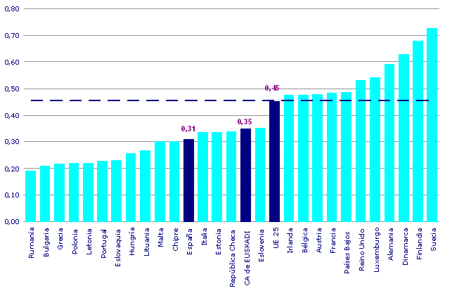La C.A. de Euskadi, junto con Eslovenia –también con 0,35 centésimas como en el caso vasco-, Italia, Estonia y República Checa, todas ellas con 0,34, España -0,31-, Malta -0,30- Lituania -0,27-, Hungría -0,26- y Eslovaquia -0,23-, forman un grupo intermedio.