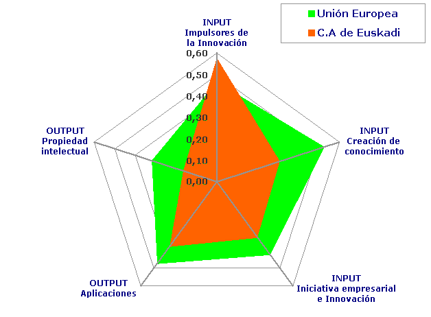 La C.A. de Euskadi, en el conjunto de los 27 países de la Unión Europea, se sitúa en el puesto 13, justamente en la mitad, del Índice Europeo de Innovación con una puntuación de 0,35 (sobre un máximo de 1,00), según datos elaborados por Eustat, estimándose la media de la Unión Europea en 0,45 en 2006. Dentro del grupo de países líderes en innovación, están Suecia -0,73-, Finlandia -0,68-, Dinamarca -0,63- y Alemania -0,59-. Si no se tiene en cuenta la pertenencia a la Unión Europea, en este colectivo están también Suiza -0,69- y Japón -0,61-.
