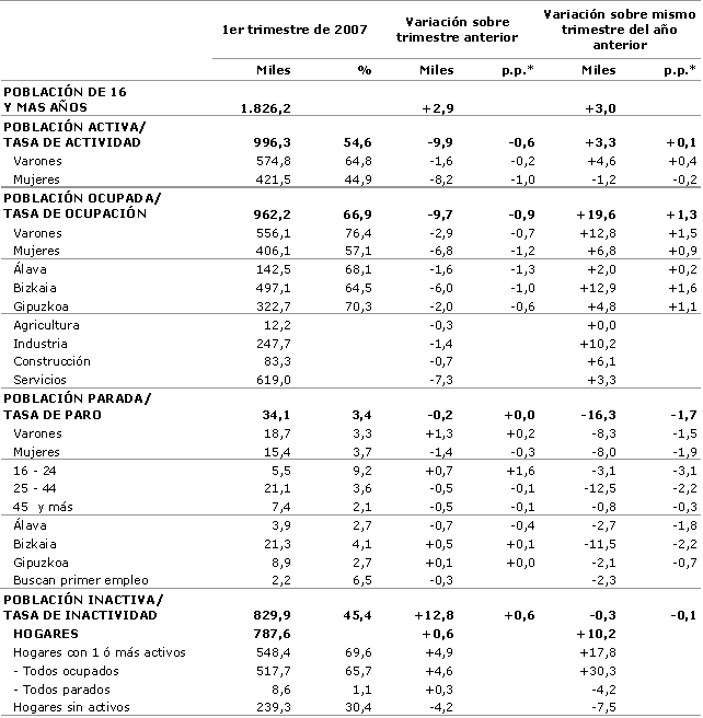 El número de parados, es decir, personas que están buscando empleo, hacen gestiones activas de búsqueda y además están disponibles para trabajar, se estima en 34.100 en este primer trimestre del año. Por territorios históricos, en Álava, con un total de 3.900, desciende el número de parados en 700 personas y cifra su tasa de paro en 2,7%; en Bizkaia, se contabilizan 21.300 parados, 500 más que hace tres meses, manteniendo todavía la tasa menos favorable (4,1%), y en Gipuzkoa, con 8.900 desempleados, se estiman 100 personas más en paro que hace tres meses y mantiene una tasa equivalente a la de Álava (2,7%).