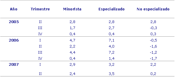 En el comercio minorista especializado, la mayor tasa de crecimiento interanual ha correspondido al sector de Otros bienes de consumo (deportes, juguetes, ópticas y librerías, entre otros), que ha registrado un crecimiento nominal del 12,4%, que en términos reales fue del 10,1%. Los Bienes de equipamiento de la persona han tenido también un crecimiento notable, del 3,9% en términos nominales, que se traduce en una tasa, también positiva, del 3,7% en términos reales. Las ventas de los productos del Equipamiento del hogar crecen un 0,8% en euros corrientes, obteniendo un decrecimiento del 1,4% en términos reales. Por otro lado, la partida de Alimentación ha tenido un decrecimiento nominal del 1,4% y esta tasa se convierte en un -5,5% en términos reales.