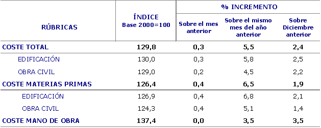 En el mes de febrero los mayores crecimientos de los precios se han producido en las materias primas consumidas de Derivados del petróleo (4,1%), Piedra elaborada (4,1%), Productos asfálticos (3,5%), Vidrio (2,9%) y Cal, yeso y escayola (2,2%), entre otros. En sentido contrario, han tenido una reducción en sus precios las materias primas de Accesorios de maquinaria utilizada (-2,4%), Explosivos y gases (-1,6%), Tubería metálica (-0,8%) y Aparatos y material eléctrico (-0,2%), entre otros.