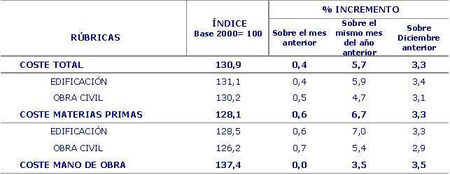 En el mes de abril los mayores crecimientos de los precios se han producido en las materias primas consumidas de Derivados del petróleo (4,0%), Productos asfálticos (4,0%), Vidrio (2,9%), Tubería metálica (2,7%), Hierro y acero (2,5%) y Explosivos y gases (1,6%), entre otros. En sentido contrario, han tenido una reducción en sus precios las materias primas de Energía eléctrica (-4,6%), Cal, yeso y escayola (-1,5%), Áridos de extracción (-0,3%), Cemento artificial (-0,2%) y Madera y corcho (-0,2%), entre otros.