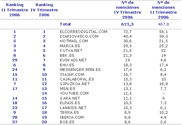 La página web más visitada es “elcorreodigital.com”, ya que un 11,7% del total de personas usuarias de Internet recuerdan este espacio, lo que supone un total de 72.700 menciones. Los siguientes medios de comunicación más mencionados son “diariovasco.com”, con un porcentaje del 6,5%, y “marca.es”, con el 4,7%.