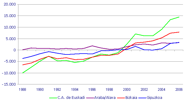 La movilidad geográfica externa o extracomunitaria, que ha afectado durante 2006 a 27,9 de cada mil habitantes de la C.A. de Euskadi (Álava 35,7‰, Bizkaia 29,2‰ y Gipuzkoa 22,5‰), es relativamente reducida si se compara con el resto de las comunidades autónomas, donde se mueven 47 de cada mil habitantes.