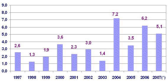 En el mes de julio los mayores crecimientos de los precios se han producido en las materias primas consumidas de Energía eléctrica (2,7%), Productos asfálticos (1,0%), derivados del petróleo (0,8%) y Áridos de extracción (0,6%), entre otros. En sentido contrario, han tenido una reducción en sus precios las materias primas de Cal, yeso y escayola (-0,5%), Hierro y acero (-0,4%), Explosivos y gases (-0,4%) y Tubería metálica (-0,3%), entre otros.