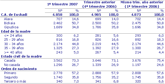 En la distribución de los nacimientos según la edad de la madre, continúa manteniéndose una clara preponderancia del grupo de madres de 30-34 años, entre las que se produce casi la mitad de los alumbramientos. A este grupo le sigue el inmediatamente superior de 35-39 años con el 27,3%, superando al grupo de 25-29 años que aporta el 16,8%. En los grupos de edades extremas, el de menores de 25 años supone el 6,2%, mientras que el de mayores de 40 únicamente aporta el 5% de los nacimientos.