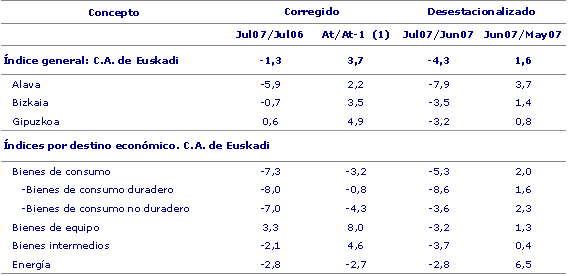 La producción industrial de la C. A. de Euskadi en julio de 2007 decreció un 1,3% con respecto al mismo mes del año 2006, en términos homogéneos de calendario laboral, según datos elaborados por EUSTAT. En los siete primeros meses del año el crecimiento acumulado ha sido del 3,7% sobre el mismo período de 2006.