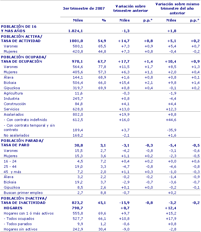 La población ocupada ha crecido en los últimos doce meses en 10.400 personas, un 1,1%. Este aumento se ha producido en dos de los tres territorios, creándose 9.800 empleos netos en Bizkaia y 800 en Álava, mientras que en Gipuzkoa se mantiene estable. Por sectores, el sector servicios es el que más empleos ha generado, con 12.300 empleos adicionales, seguido por la construcción con un aumento de 4.400 empleos netos. Por otro lado, en la industria desciende el nivel de empleo en 4.400 personas, aunque, como ya se ha comentado, en el tercer trimestre se ha roto la tendencia negativa con un incremento de 800 personas ocupadas en la industria y, finalmente, en el sector primario se pierden 1.900 personas ocupadas.