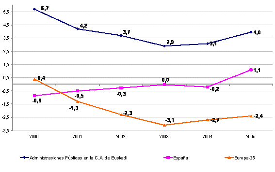 Las Administraciones Públicas en la C. A. de Euskadi mantienen en 2005 la trayectoria superavitaria de años anteriores, mejorando en nueve décimas porcentuales el logrado en 2004. En el caso de España, su sector de Administraciones Públicas pasó de tener un déficit del 0,2% en términos del PIB en 2004, a tener un superávit del 1,1% en 2005; en la Unión Europea-25, su déficit ha mejorado algo, pasando del 2,7 % de 2004 al 2,4% del PIB en 2005.
