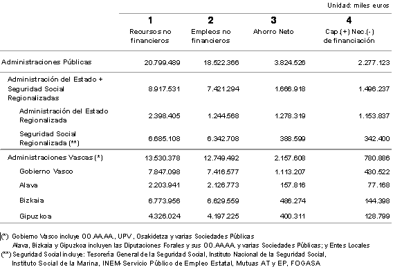 En el periodo 2000-2005, las Administraciones Públicas en la C.A. de Euskadi han aumentado sus recursos no financieros en un 31,7% y los empleos no financieros en un 38,3%; como resultado, la capacidad de financiación se ha reducido un 5% en este periodo. De 2000 a 2003 la capacidad de financiación disminuyó, pero en los años 2004 y 2005 se ha incrementado, superando para este último año los 2.000 millones y acercándose a los niveles del año 2000.