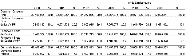 Tabla 2: Participación de la Administraciones Públicas en la Demanda Final. C. A. de Euskadi (miles euros). 2000-2005