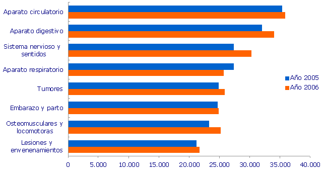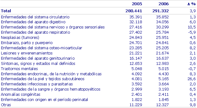 Las enfermedades del sistema circulatorio, con el 12,3% del total de las altas en el año 2006, continúan siendo la principal causa de hospitalización, a diferencia del conjunto del Estado, donde pasaron a ocupar un segundo lugar, después del grupo de embarazo, parto y puerperio (año 2005). Dentro de este grupo, venas varicosas, insuficiencia cardiaca, arterioesclerosis coronaria, y disrritmias cardiacas fueron las patologías que motivaron más número de hospitalizaciones.