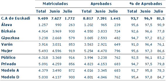 En el año 2007 se matricularon 9.409 jóvenes para presentarse a las Pruebas de Acceso a la Universidad en la C.A. de Euskadi, según datos elaborados por Eustat. Las pruebas fueron superadas un total de 8.817 jóvenes, lo que supuso un 94% de aprobados con una nota media rozando el notable, un 6,7. En comparación con la media del Estado (81%), el porcentaje de aprobados fue 13 puntos porcentuales superior.
