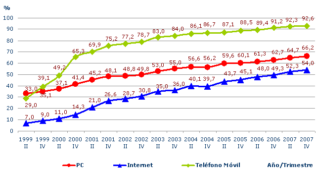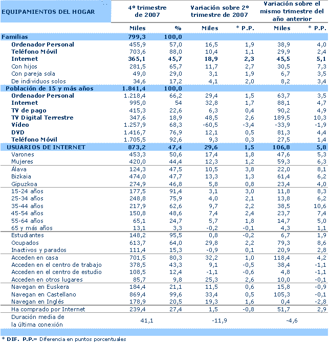 Respecto al segundo trimestre de 2007, el crecimiento en el número de usuarios de Internet para el conjunto de la C.A. de Euskadi fue del 3,5%, siendo Álava el territorio donde se produce el mayor incremento, un 9,2% respecto al segundo trimestre de 2007, pasando a ocupar la segunda posición en cuanto a porcentaje de usuarios de Internet, con el 47,5%. Gipuzkoa, que registra un incremento del 2,2%, cuenta con un 46,8% de personas usuarias de Internet en los últimos tres meses. Bizkaia aumenta en un 2,9%, cifrándose en el 47,7% el porcentaje de población mayor de 14 años usuaria de Internet, por lo que se mantiene en primer lugar.