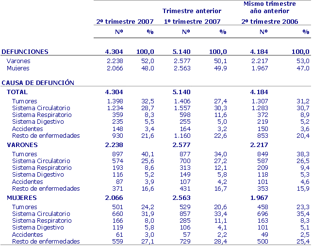 La principal causa de defunción la constituyeron los tumores, ya que 1.398 personas fallecieron por ese motivo (32,5%). Como segunda causa de mortalidad figuran las enfermedades del sistema circulatorio, que originaron 1.234 fallecimientos (28,7%) y el tercer lugar lo ocuparon las enfermedades respiratorias, que en estos meses causaron 359 defunciones (8,3%).