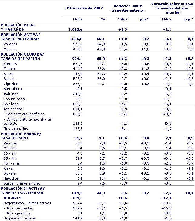 Los datos del cuarto trimestre de 2007 ofrecen la misma tasa de paro que el trimestre anterior, quedando en el 3,1%. La tasa de paro femenina baja al 3,6% (0,1 puntos porcentuales menos), mientras que la masculina sube una décima de punto situándose en el 2,8%. La tasa de paro juvenil sigue siendo la más alta con el 7,1%, aunque ha descendido en 0,1 puntos porcentuales, afectando el desempleo a 4.300 jóvenes activos de 16 a 24 años.