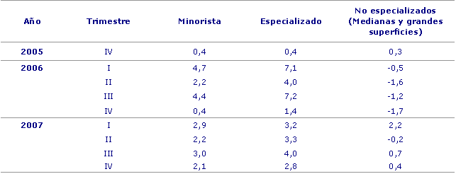 En el comercio minorista especializado, la mayor tasa de crecimiento interanual ha correspondido al sector de Equipamiento de la persona, que ha registrado un crecimiento nominal del 9,7%, que, en términos reales, también resulta un crecimiento del 9,7%. Los Otros Bienes de Consumo, sin embargo, han tenido una evolución más discreta, del 4,3% en euros corrientes y del 1,8% en euros constantes. Las ventas de los productos de Alimentación se incrementan un 2,3% en términos nominales, lo que supone una reducción del 2,6% en términos reales. Las ventas de los productos de Equipamiento del Hogar han registrado un descenso del 3,8% en términos nominales que se convierte en un descenso del 5,4% en términos reales. En el apartado del comercio minorista no especializado, los subsectores con predominio de alimentación han incrementado sus ventas interanuales en un 5,0%, mientras que los de predominio del Resto de productos obtienen un aumento del 4,1%. En euros constantes, aumentan un 0,3% y un 1,2%, respectivamente.