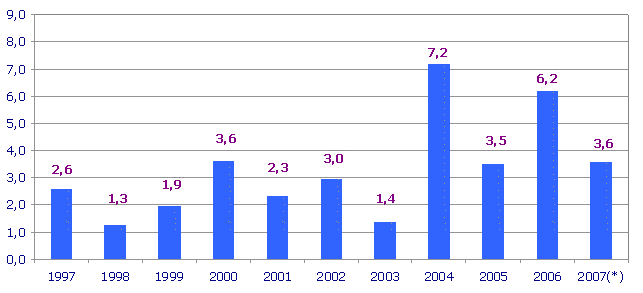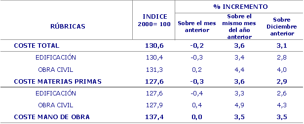 Entre los precios de las materias primas consumidas por el sector que han experimentado mayores tasas de inflación en el conjunto de los últimos doce meses figuran: Derivados del petróleo (25,8%), Vidrio (19,0%), Productos asfálticos (14,6%), Tubería metálica (9,9%), y Cal, yeso y escayola (8,5%). Por otra parte, han registrado reducciones o menores incrementos en sus precios interanuales (noviembre de 2007 sobre noviembre de 2006) las materias primas de Energía eléctrica (-2,1%), Estructuras y calderería (-1,5%), Hierro y acero (-1,0%) y Productos cerámicos (0,0%).