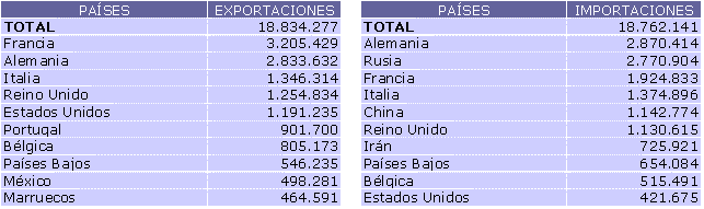 Por países, más de la mitad de las exportaciones de la C.A. de Euskadi han sido absorbidas por cinco países: Francia (17,0%), Alemania (15,1%), Italia (7,2%), Reino Unido (6,7%) y Estados Unidos (6,3%). De la misma forma, son cinco los países de origen de nuestras importaciones que hacen superar la mitad de ellas: Alemania (15,3%), Rusia (14,8%), Francia (10,3%), Italia (7,3%) y China (6,1%).