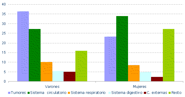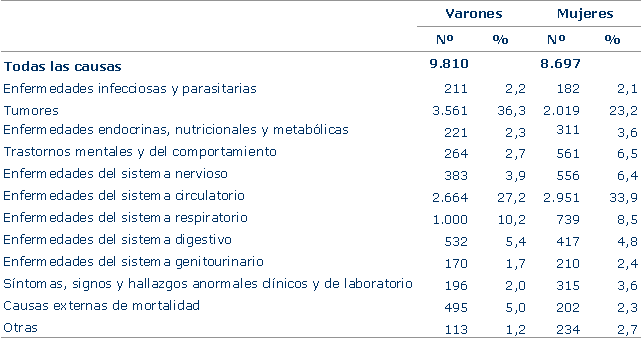 El 30,3% de las defunciones ocurridas en 2006, 5.615 muertes, se debieron a enfermedades del aparato circulatorio; a continuación se situaron los tumores, con un 30,2% (5.580 defunciones) y, en tercer lugar, a mayor distancia, las enfermedades respiratorias, que supusieron el 9,4% (1.739).