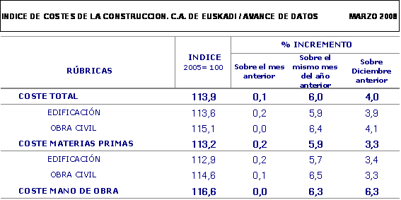 El Índice de Costes de la Construcción en la C.A. de Euskadi registró una subida del 0,1% en el mes de marzo de 2008 con respecto al mes anterior, con lo que la tasa interanual para dicho mes se eleva al 6%, según datos facilitados por Eustat.