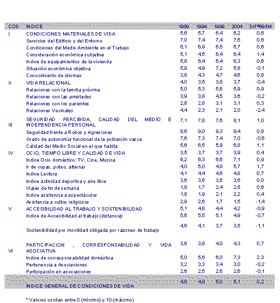 Con el fin de tener una visión global de la evolución de las condiciones de vida en la C.A. de Euskadi durante el período 1989-2004, se han estudiado 25 indicadores distribuidos en seis grandes dimensiones y, como conclusión general, se puede señalar que la evolución del Indice General de Condiciones de Vida de la C.A. de Euskadi ha mejorado de un 4,8 en 1989 a un 5,01 en 2004 en una escala de 0 a 10, según datos elaborados por Eustat.