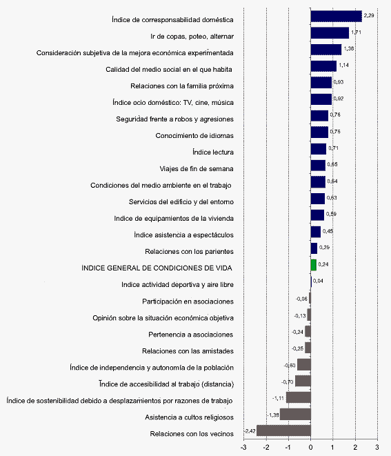 Del análisis de los datos, se desprende que ha habido una mejora en las condiciones materiales de vida en el período 1989-2004 aprovechando la bonanza económica acaecida en este lapso de tiempo. Por el contrario, se observa un cierto retroceso en los indicadores relacionados con aspectos que tienen que ver con la sociabilidad, con la sostenibilidad y con la participación social.