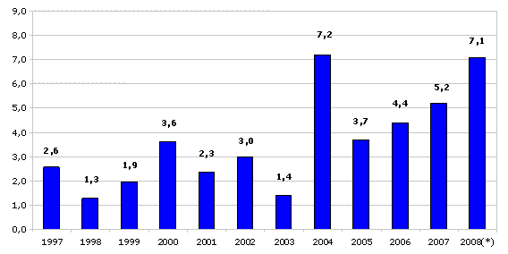 Entre los precios de las materias primas consumidas por el sector que han experimentado mayores tasas de inflación en el conjunto de los últimos doce meses figuran: Minerales no metálicos (16,4%), Energía eléctrica y gas (12,1%), Agua (11,4%) y Refino de petróleo (9,0%). Por otra parte, han registrado menores incrementos en sus precios interanuales (abril de 2008 sobre abril de 2007), las materias primas de Metalurgia (0,3%), Maquinaria (2,0%) e Industria de la madera (2,1%).