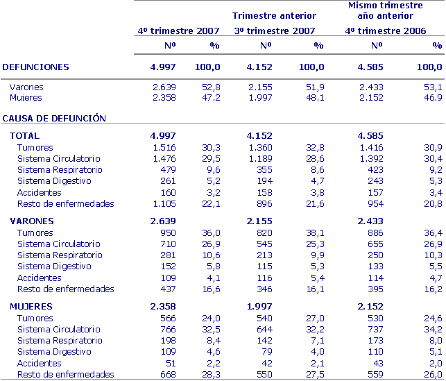 El 30,5% de las defunciones ocurridas en 2007, 5.684 muertes, se debieron a tumores. A continuación se situaron las enfermedades del sistema circulatorio, con un 29,4% (5.468 defunciones) y, en tercer lugar, a mayor distancia, las enfermedades respiratorias, que supusieron el 9,6% (1.793).