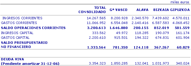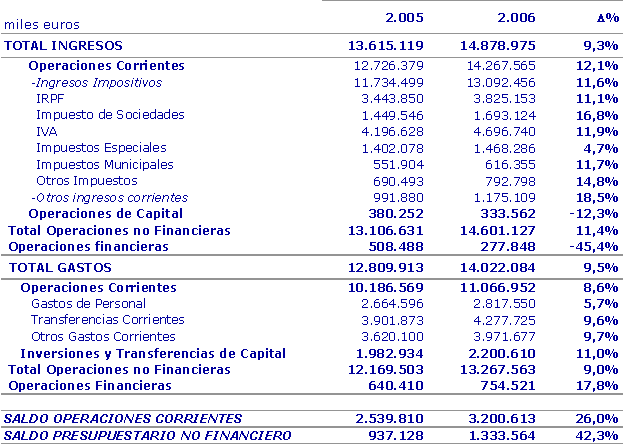 Entre los capítulos del gasto corriente, el de menor crecimiento fue el de Gastos de Personal, con un 5,7%, seguido de las Transferencias Corrientes que crecieron un 9,6% y los otros gastos corrientes (gastos de funcionamiento), un 9,7%. En consecuencia, el gasto corriente alcanzó un incremento del 8,6%, lo que, frente al mayor crecimiento de los ingresos corrientes (12,1%), generó un crecimiento del saldo de operaciones corrientes en 2006 del 26,0%.