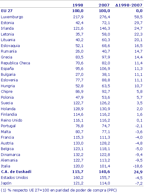 Si la comparación se realiza con los países de la Unión Europea, la C.A. de Euskadi se sitúa en tercer lugar, detrás de Luxemburgo (276,4) y de Irlanda (146,3), seguida de Holanda (130,9) y de Austria (128,2). En el caso del país que le precede en la lista, Irlanda, cabe decir que en el último año la distancia se ha recortado de 9,6 puntos porcentuales en 2006 a casi la mitad, 5,7 puntos porcentuales en 2007.
