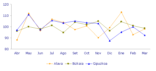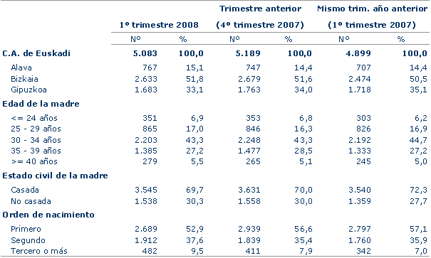 En la distribución de los nacimientos según la edad de la madre, continúa manteniéndose una clara preponderancia del grupo de madres de 30-34 años, entre las que se produce casi la mitad de los alumbramientos. A este grupo le sigue el inmediatamente superior de 35-39 años con el 27,2%, superando al grupo de 25-29 años, que aporta el 17%. En los grupos de edades extremas, el de menores de 25 años supone el 6,9%, mientras que el de mayores de 40 únicamente aporta el 5,5% de los nacimientos.