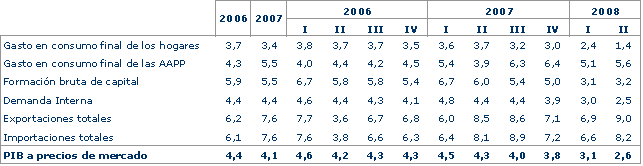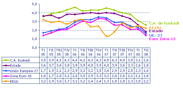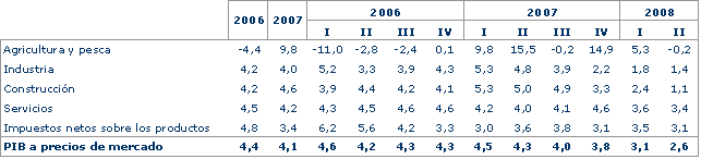 El Sector Servicios presenta una tasa más positiva que la del PIB, con un crecimiento global del 3,4%, aunque dentro del mismo los comportamientos han sido distintos. Los Servicios de Mercado alcanzan un crecimiento interanual del 2,7%, tasa similar a la del crecimiento del PIB. Los Servicios de No Mercado, por su parte, mantienen el ritmo de crecimiento alto, con un incremento interanual idéntico al del trimestre precedente, del 6,5%.