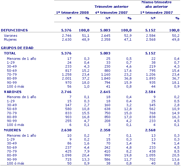 En el primer trimestre de 2008 fallecieron en la C.A. de Euskadi 5.376 personas, un 4,3% más que en el mismo período del año anterior, según datos de EUSTAT. Por territorios, en Bizkaia fallecieron 2.960 personas, con un aumento del 7,3%, 1.470 en Gipuzkoa (+1,3%), mientras que en Álava los fallecimientos fueron 676, cifra idéntica a la del primer trimestre de 2007.