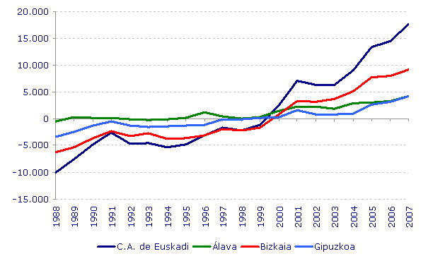 La movilidad geográfica externa, que ha afectado durante 2007 a 30,5 de cada mil habitantes de la C.A. de Euskadi (Álava 37,5‰, Bizkaia 30,7‰ y Gipuzkoa 27,1‰), es relativamente reducida si se compara con el resto de las comunidades autónomas, donde se mueven en promedio 51 de cada mil habitantes.
