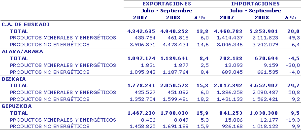 Las secciones arancelarias más voluminosas, en el conjunto de la C.A. de Euskadi, son las que más han contribuido a la evolución positiva de las exportaciones trimestrales, sobre todo los Metales y sus manufacturas, que han incrementado sus ventas en el extranjero en un 41,2% y el Material eléctrico con un 9,7%. También son importantes los crecimientos de los Productos minerales (6,0%) y Plástico y caucho (11,6%), por citar los más importantes. En sentido contrario ha evolucionado la sección arancelaria de Material de transporte, la cual registra un recorte del 7,0%. En el apartado de las importaciones, son destacables los crecimientos de los Metales y sus manufacturas con un incremento del 20,5% y Productos minerales con un 49,3%, y es notable la caída de las importaciones de Material de transporte, cifrada en un 28,8%.