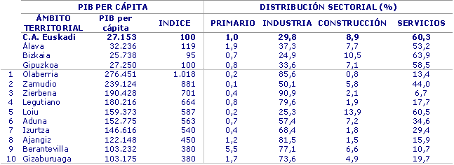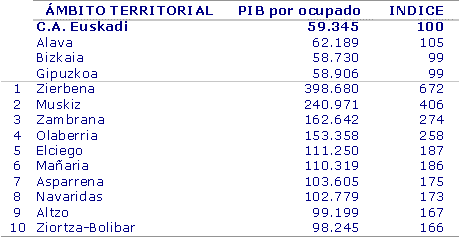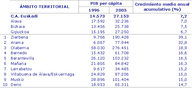 En cuanto a la evolución del PIB per capita en los últimos diez años, los municipios de Zierbena en Bizkaia y Arama en Gipuzkoa son los que han experimentado mayores crecimientos, con incrementos medios anuales acumulativos del 39,1% y 32,8% respectivamente, siendo la media de la C.A. de Euskadi del 7,2%.