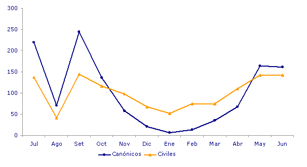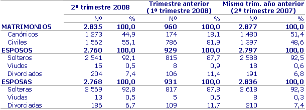 Respecto a la distribución de los matrimonios según la edad de los cónyuges, el 75,4% de los esposos tenía más de 30 años, mientras que entre las esposas este porcentaje supuso el 61,7%. Estas proporciones son mayores que las que se dieron en el mismo período de 2007 (73,9% y 58,1%, respectivamente) lo que mantiene, un trimestre más, la tendencia al alza en la edad de la población de contraer matrimonio.
