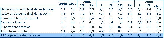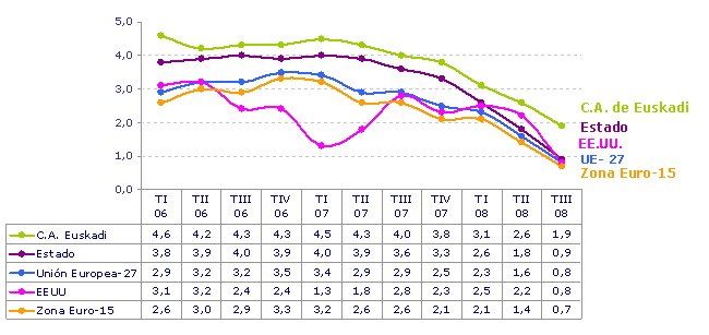 Este tercer trimestre de 2008 ofrece la creación neta de más de 5.000 puestos de trabajo, un 0,6% más en tasa interanual. Sectorialmente, el único sector que ofrece una tasa positiva es el de servicios, con un crecimiento del 1,6%, mientras que el resto de los sectores ofrece tasas negativas del 0,3% el primario, del 0,2% el industrial y del 3,8% la construcción.