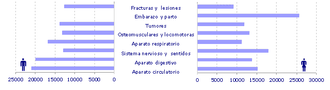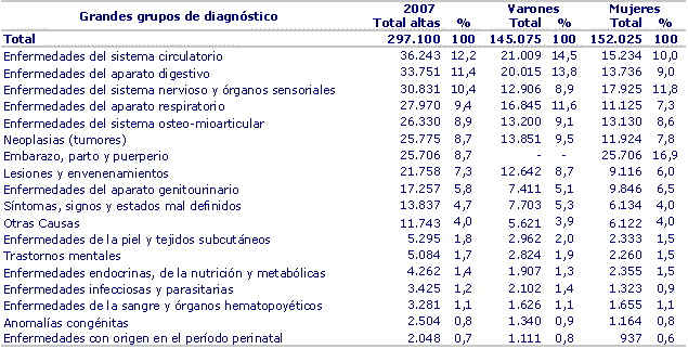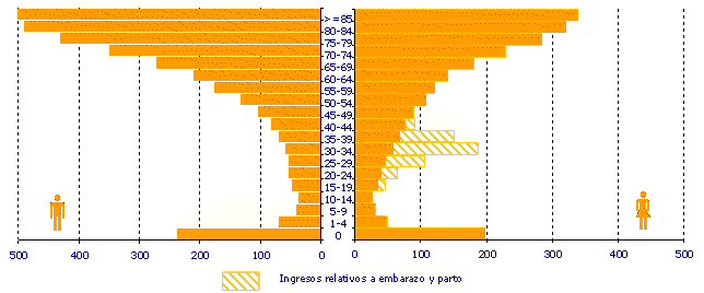 Los cambios degenerativos propios del envejecimiento son los responsables de las altas tasas hospitalarias a partir de los 65 y más años, tasas que van en aumento conforme avanza la edad, llegando en las personas mayores de 85 años a alcanzar la cifra de 392 altas por cada 1.000 habitantes. A su vez, en el lado opuesto, el grupo de menores de 1 año, también presenta altas tasas debido, sobre todo, a trastornos de bajo peso en el nacimiento y enfermedades respiratorias: “bronquitis y bronquiolitis agudas”.