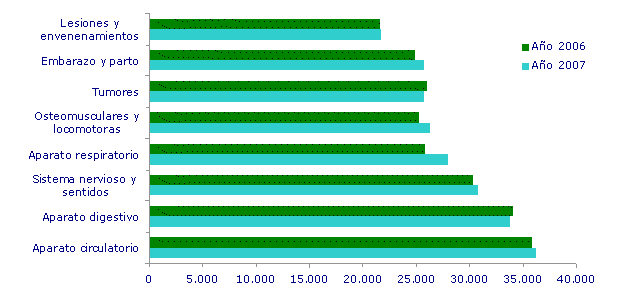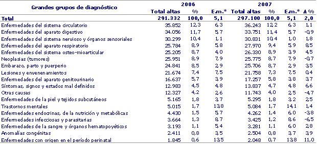 Las enfermedades respiratorias destacaron por tener un incremento del 8,5%, respecto al año 2007. Este grupo, que constituye la cuarta causa más frecuente de ingreso hospitalario, tuvo mayor incidencia en los meses de enero, febrero y diciembre. También las enfermedades de origen en el periodo perinatal, que representan el 0,7% del total de altas, destacaron con un aumento del 11% respecto al año anterior, debido principalmente a trastornos derivados del nacimiento prematuro y bajo peso al nacer.