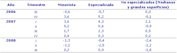 En el comercio minorista especializado, la mayor tasa de crecimiento interanual ha correspondido al sector de Equipamiento de la persona, que ha registrado un crecimiento nominal del 7,4%, que en términos reales fue del 7,5%. La Alimentación ha tenido también un crecimiento del 2,6% en términos nominales, que se traduce en una tasa negativa del -2,1% en términos reales. Las ventas de los productos de Otros Bienes de Consumo suben un 1,8% en euros corrientes, obteniendo un crecimiento del 0,4% en términos reales. Por otro lado, los productos de Equipamiento del Hogar han tenido un descenso nominal del 3,9% y esta tasa se convierte en una bajada del 6,3% en términos reales.